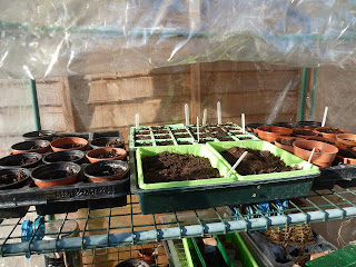 The double daffodils are coming out now too, and the lilac is starting to grow its leaves. And, while the sun today has been absent , it is starting to filter through the clouds as I speak. Just as I have finished covering the seedlings, plug plants and seed trays with fleece for the night. Did I mention that I upended the packet of nemesia seeds and the whole lot fell into one seed tray? They are very small and totally invisible on potting soil and then I looked at the packet. 750 seeds. Right. That could be interesting.